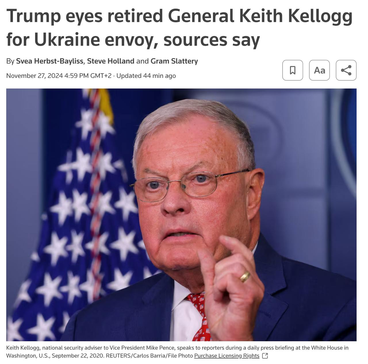 Обраний президент США Дональд Трамп може призначити спеціальним представником в Україні 80-річного Кіта Келлогга, відставного генерал-лейтенанта, який представив йому план припинення війни.
