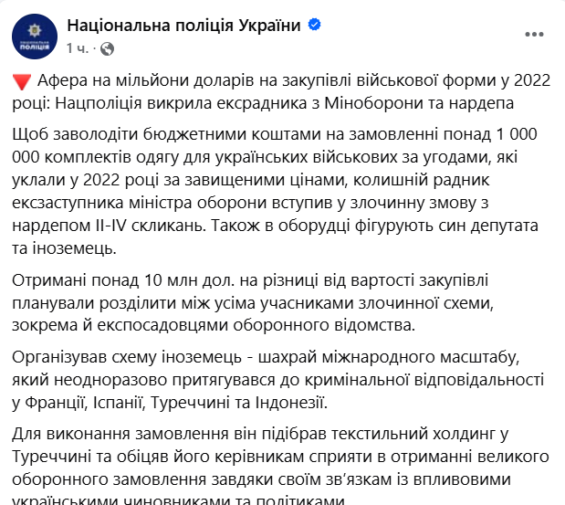 За версією слідства, 2022 року вони сприяли укладенню угоди про постачання понад мільйон комплектів одягу для українських військових за завищеними цінами, вкравши на цьому понад 10 млн дол.