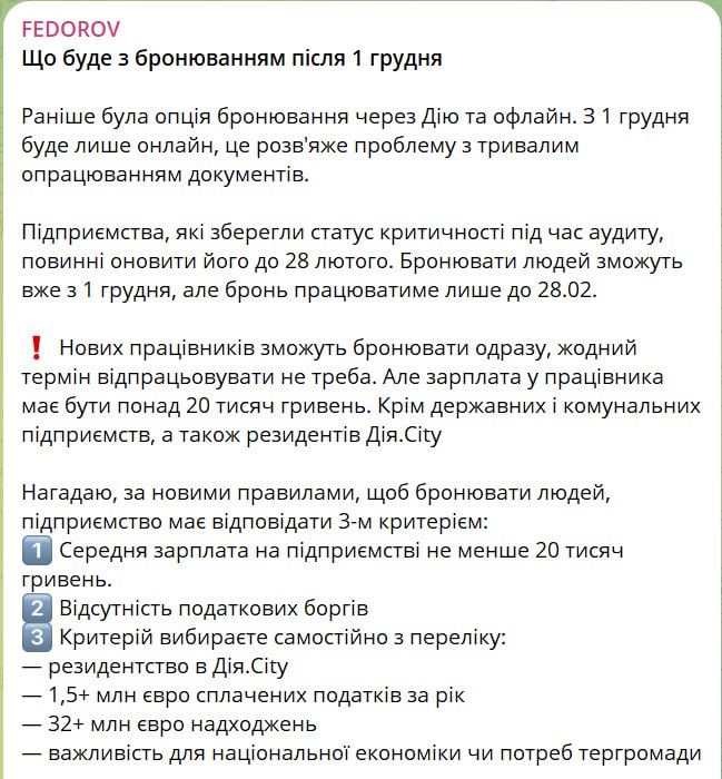 Як зазначив Федоров, нових працівників матимуть змогу бронювати одразу, відпрацьовувати якийсь термін на підприємстві для отримання броні не потрібно. Але зарплата у працівника має бути понад 20 тисяч гривень.