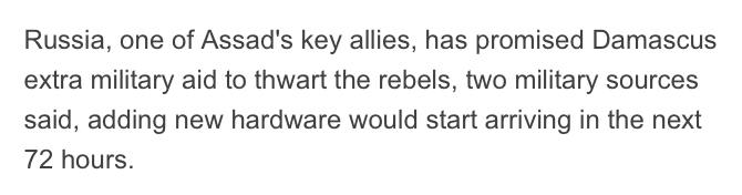 Росія пообіцяла відправити владі Сирії військову допомогу на фоні входу загонів опозиції до Алеппо. Про це пише Reuters з посиланням на два військові джерела.