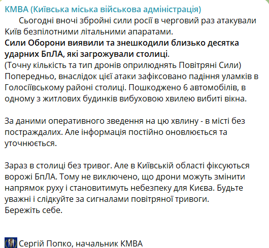 "Сили Оборони виявили та знешкодили близько десятка ударних БПЛА, які загрожували столиці", - йдеться у повідомленні.