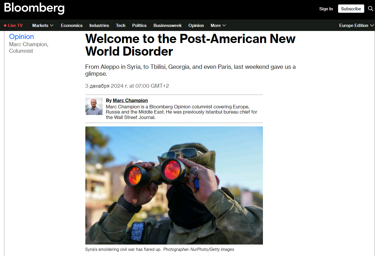 "Якщо вам цікаво дізнатися, як виглядатиме постамериканський світ, уважно подивіться на те, що відбувалося останні кілька днів, і ви отримаєте, як я вважаю, досить точну картину. У Сирії розгорілася тліюча громадянська війна, і ісламістська терористична організація "Хайят Тахрір" аш-Шам" знову захопила північне місто Алеппо. Ніхто не питав дозволу США на ці дії. А Ізраїль проігнорував протидію США його вторгненню в Ліван і війні, що триває, в Газі", - написав Чемпіон.