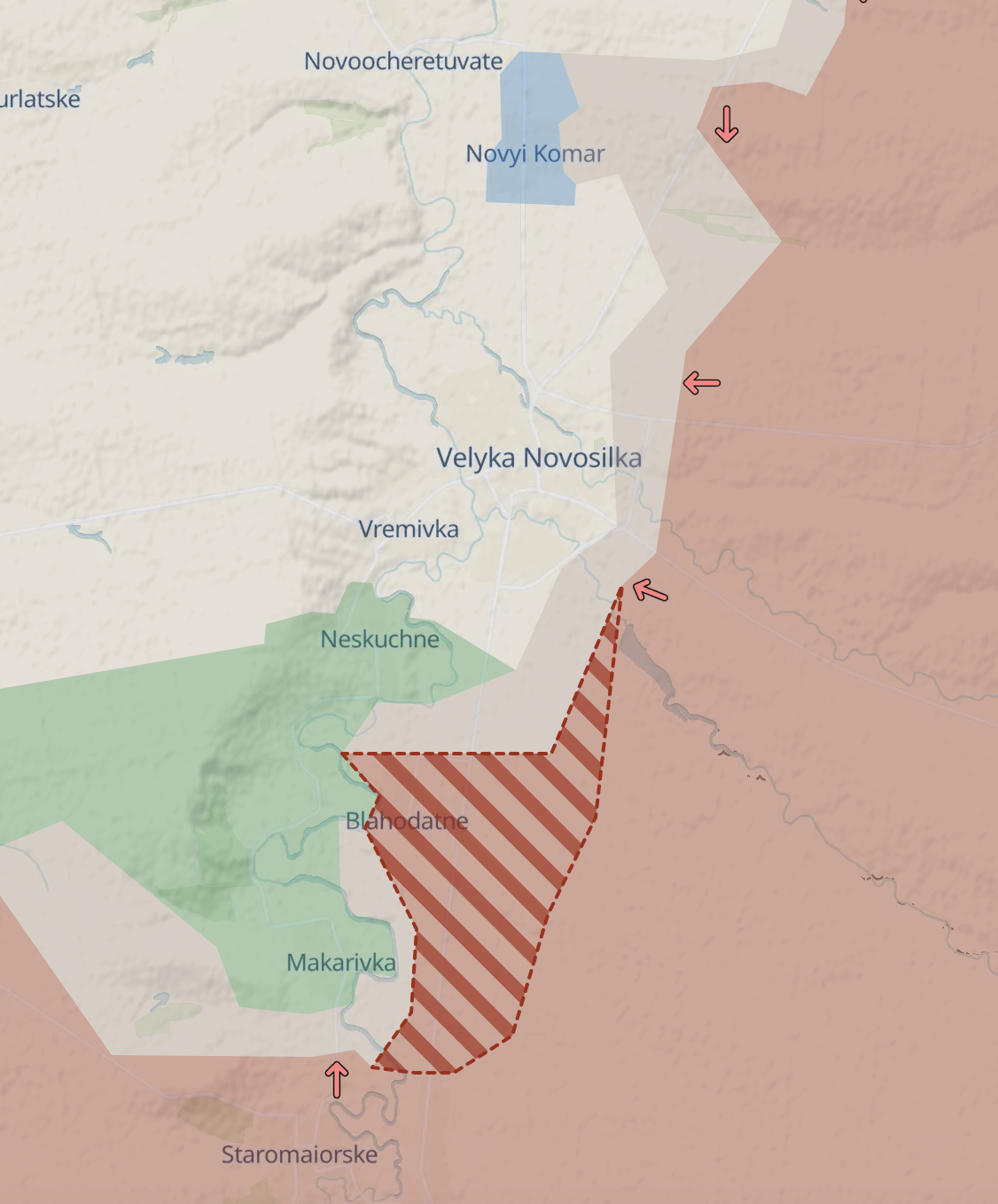 Водночас, росіяни просунулися на південь від Великої Новосілки, захопивши, за даними українських військових, село Благодатне. Воно було звільнено Україною в ході контуру наступу влітку 2023 року.