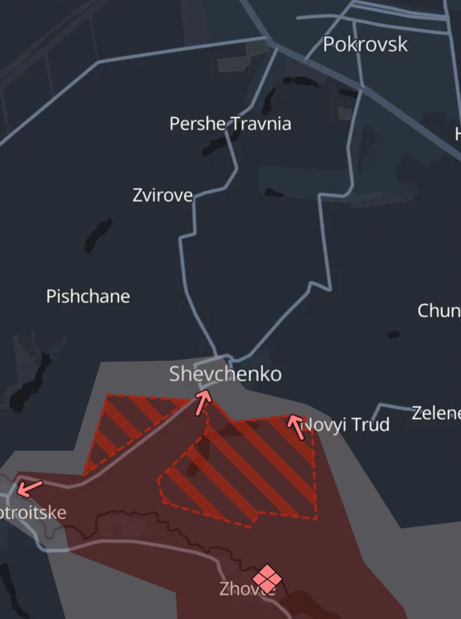 Бої точаться вже приблизно у половинi великого селища Шевченка за три кілометри від околиць Покровська (російські паблики заявляють про захоплення половини Шевченка).