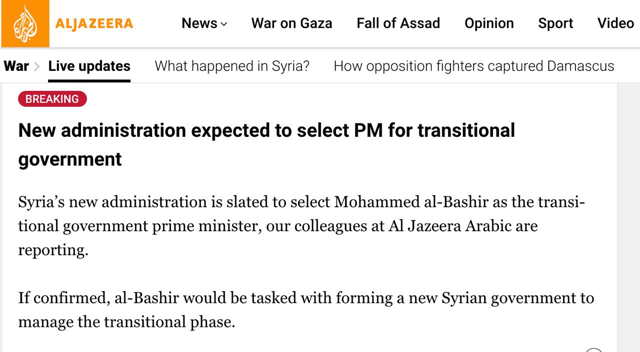 А катарський телеканал Al Jazeera з посиланням на джерела передає, що головною перехідного уряду Сирії буде призначено Мухаммада аль-Башира.