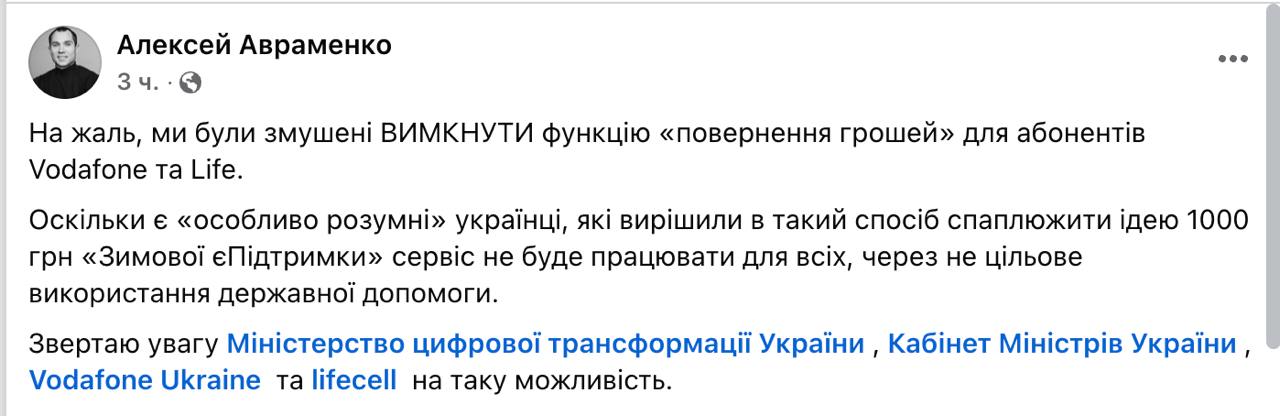 "На жаль, ми були змушені вимкнути функцію повернення грошей для абонентів Vodafone та Life. Оскільки є "особливо розумні" українці, які вирішили таким чином спаплюжити ідею 1000 гривень "Зимової єПідтримки", сервіс не працюватиме для всіх через нецільове використання державної допомоги ", - сказано у публікації Авраменка.
