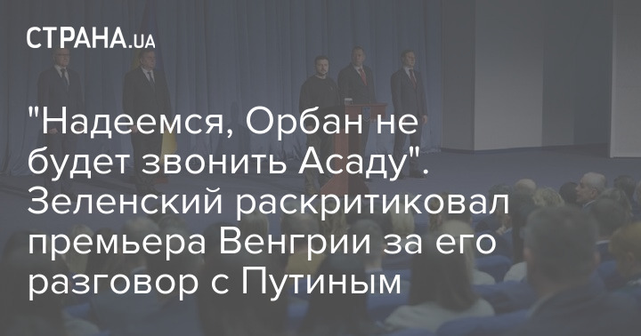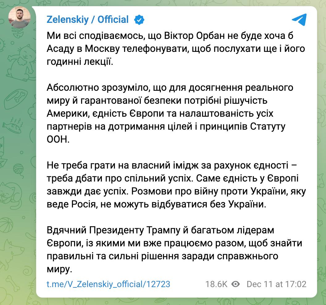 "Ми всі сподіваємося, що Віктор Орбан не буде хоча б Асаду до Москви дзвонити по телефону, щоб послухати ще й його годинні лекції. Не треба грати на власний імідж за рахунок єдності – треба дбати про спільний успіх. Розмови про війну проти України, яку веде Росія, що не можуть відбуватися без України", - написав український президент.