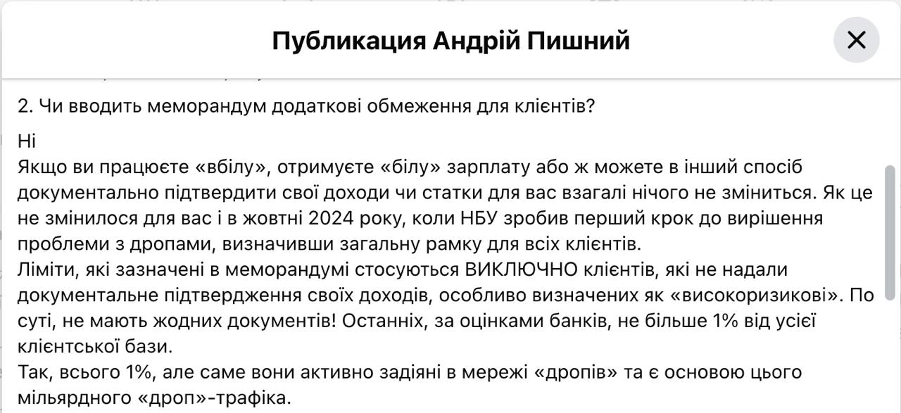 "Якщо ви працюєте "вбілу", отримуєте "білу" зарплату або можете іншим способом документально підтвердити свої доходи або стан для вас взагалі нічого не зміниться. Ліміти, зазначені в меморандумі, стосуються виключно клієнтів, які не надали документального підтвердження своїх доходів, особливо визначених" як "високорискові". По суті, не мають жодних документів! Так, всього 1%, але саме вони активно задіяні у мережі "дропів" і є основою цього мільярдного "дропу"-трафіку", - заявляє голова НБУ Андрій Пишний.