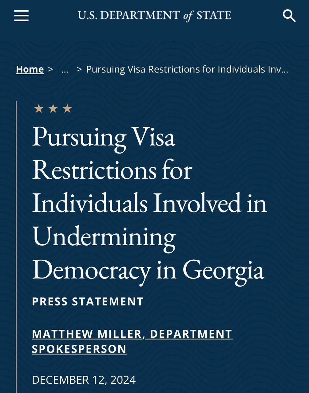 "Партія "Грузинська мрія" відмовилася від євроатлантичного майбутнього Грузії, якого в переважній більшості бажає грузинський народ і яке передбачає конституція Грузії. Ми прагнемо того, щоб високопосадовці, відповідальні за підрив демократії або причетні до нього, піддавалися візовим обмеженням йдеться у повідомленні.