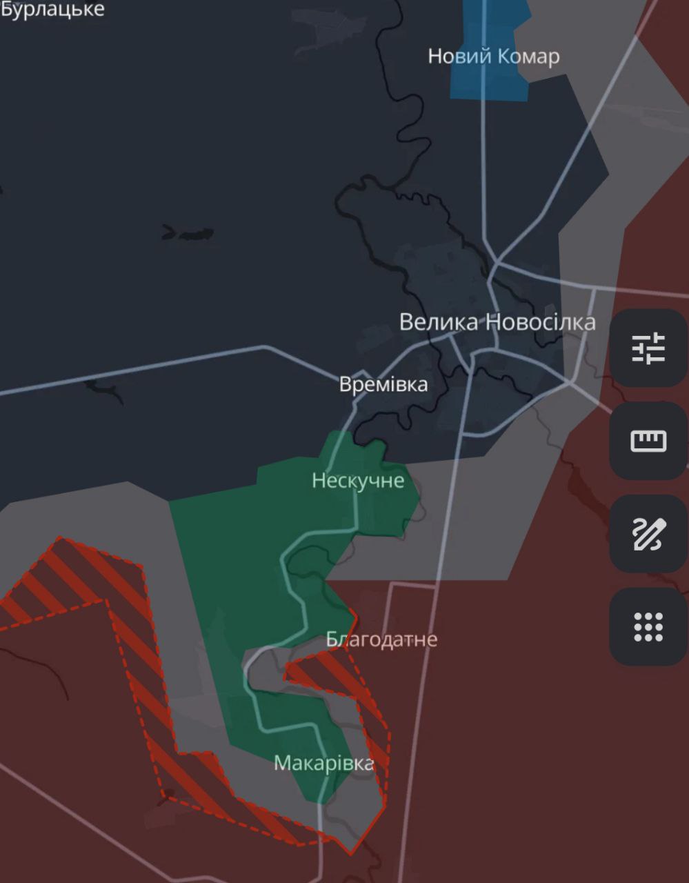 Потенційно небезпечна ситуація склалася під Великою Новосілкою. Там росіяни з півдня посунулися до траси, яка веде до міста з боку Запорізької області. До цієї дороги залишилося трохи більше півтора кілометра.