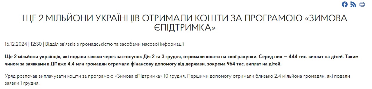 "Станом на 16 грудня загальна кількість заявок у "Дії" досягла 7,5 млн, із них 2 млн — на виплати для дітей. У процесі перевірки близько 130 тис. заявок було відхилено через невідповідність умовам програми, зокрема від громадян, які перебувають за кордоном", - сказано в прес-релізі.