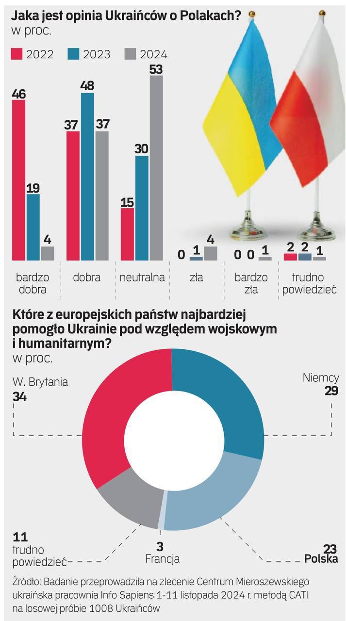2022 року добре і дуже добре ставилися до поляків 83% опитаних українців, 2023 - 67%, а 2024 - всього 41%. Ще 53% опитаних цього року заявили, що ставляться до поляків нейтрально.
