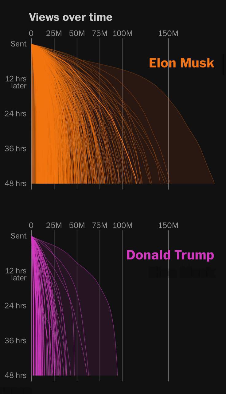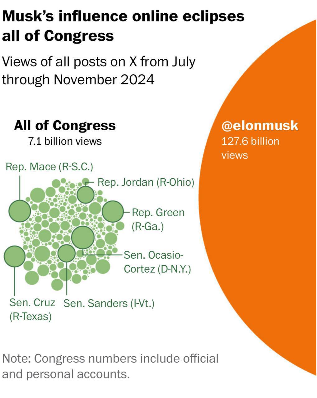 За інформацією видання, з липня 2024 року публікації Ілона Маска у соціальній мережі X набрали 133 млрд переглядів – у 15 разів більше, ніж у Трампа, та у 16 разів більше, ніж сумарне охоплення акаунтів нового складу американського Конгресу.