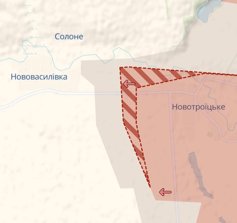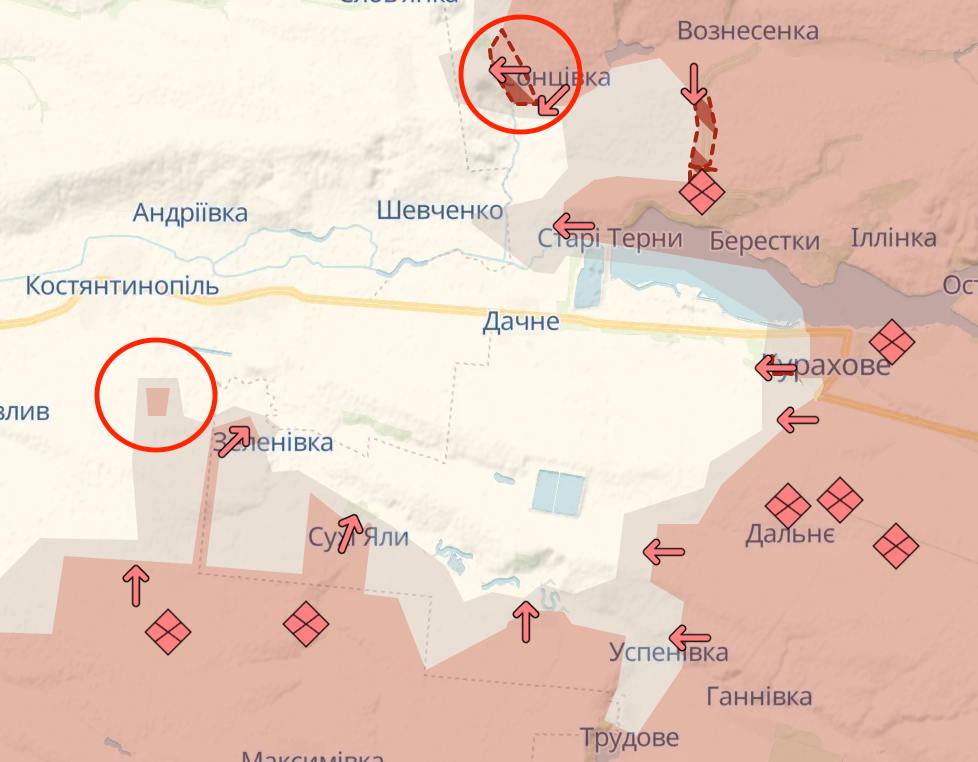 Карта Deep State свідчить, що росіяни захопили Сонцовку на північному фланзі, а на південному зайняли ділянку в полі на північний захід від Зеленівки, приблизно за два кілометри від траси на Курахово.