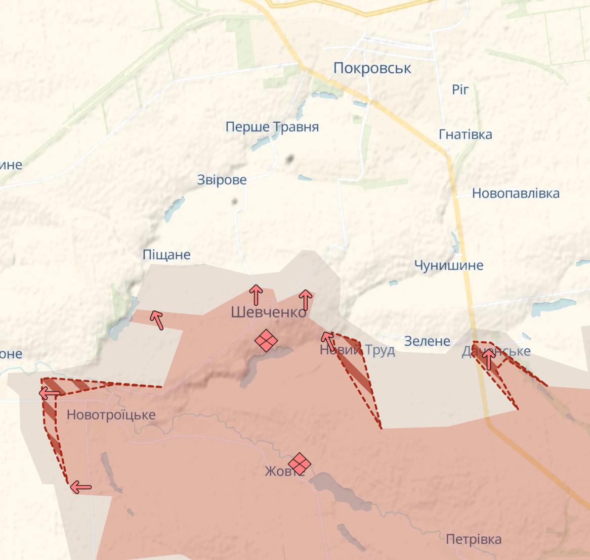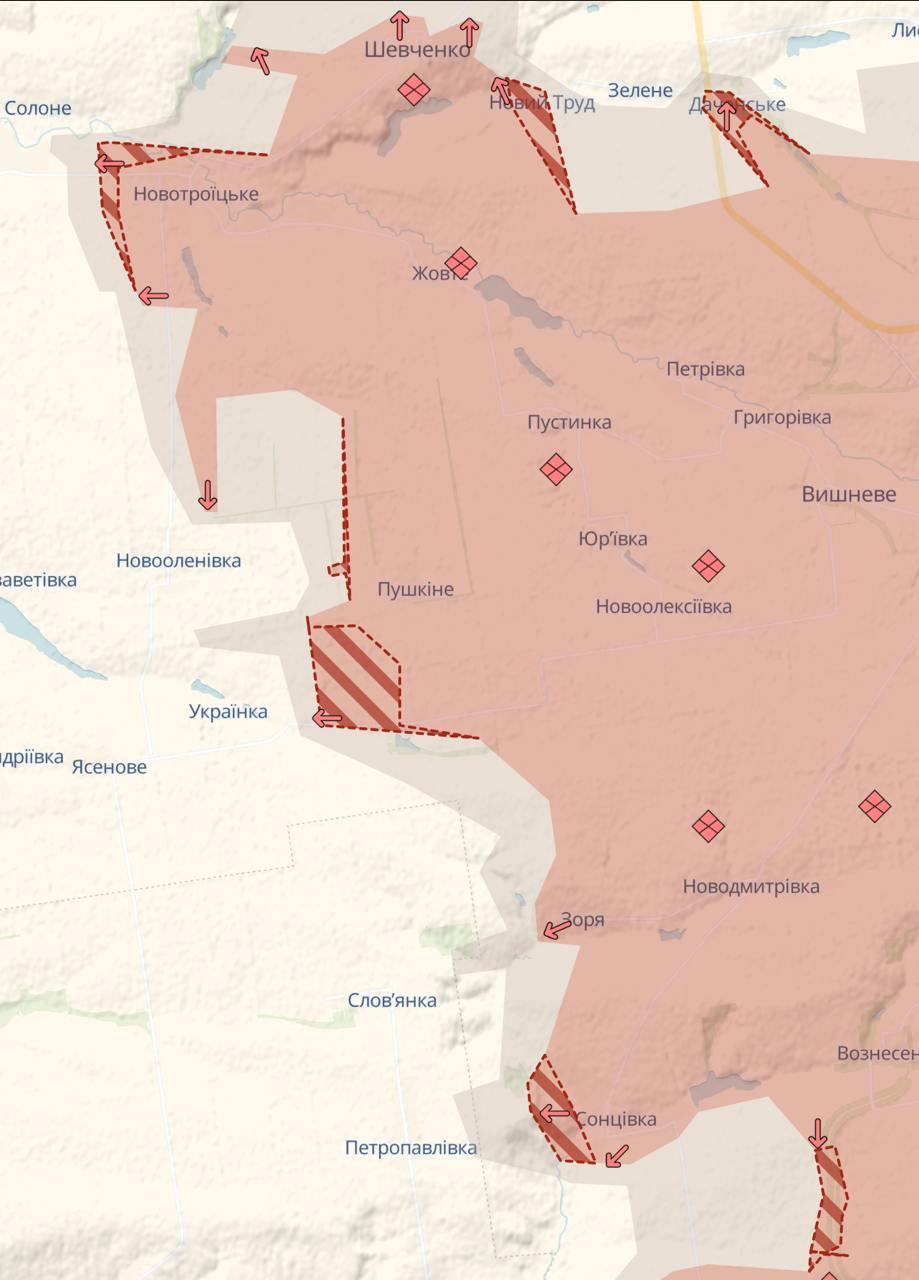 15:06 Росіяни знову просунулися Під Покровськом, свідчить карта Deep State. Зокрема, є рух по трасі з півдня в Даченському.