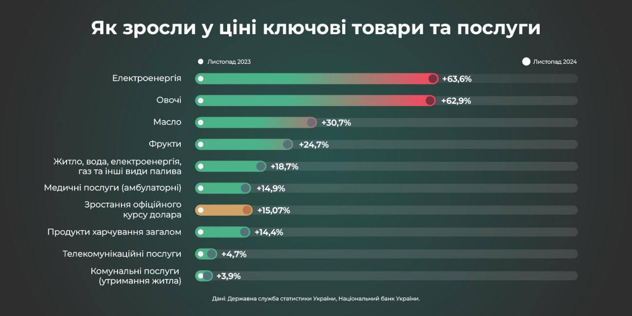 За останній рік в Україні найбільше подорожчали електроенергія та овочі. Порівняно з листопадом 2023-го у листопаді 2024-го електроенергія стала дорожчою на 63,6%, овочі – на 62,9%.