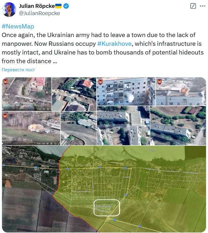 "Українській армії знову довелося залишити місто через брак людей. Тепер росіяни окупують Курахове, інфраструктура якого здебільшого не зворушена, а Україні доводиться бомбити тисячі потенційних укриттів з відстані", – повідомив Рєпке.
