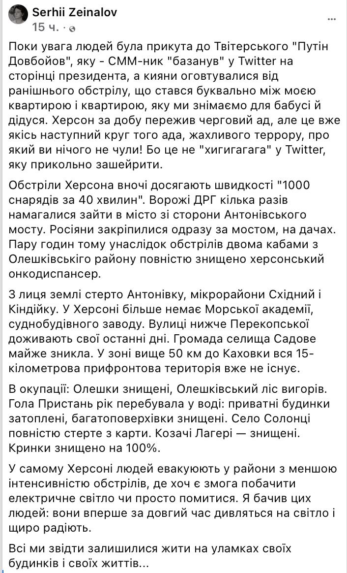 Про це пише у Фейсбуці режисер Сергій Зейналов, який жив раніше в Херсоні.