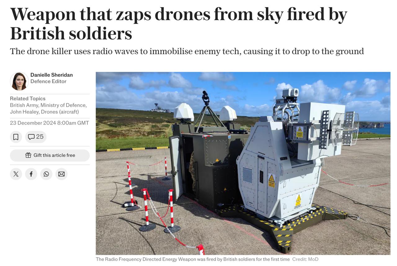 Армія Великої Британії вперше застосувала енергетичну зброю, що збиває безпілотники "за допомогою радіохвиль". Вона називається RFDEW - радіочастотна спрямована енергетична зброя.
