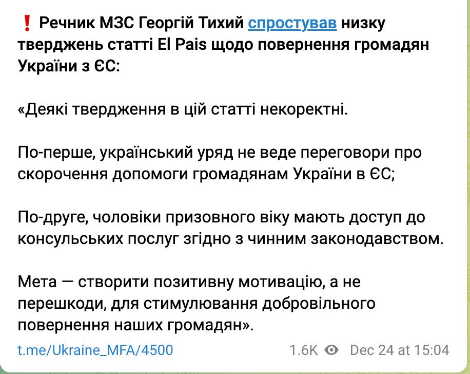 "Деякі твердження у цій статті некоректні. Український уряд не веде переговори щодо скорочення допомоги громадянам України в ЄС. Чоловіки призовного віку мають доступ до консульських послуг відповідно до чинного законодавства. Мета — створити позитивну мотивацію, а не перешкоди для стимулювання добровільного повернення наших громадян. ", – заявляє представник МЗС Георгій Тихий.