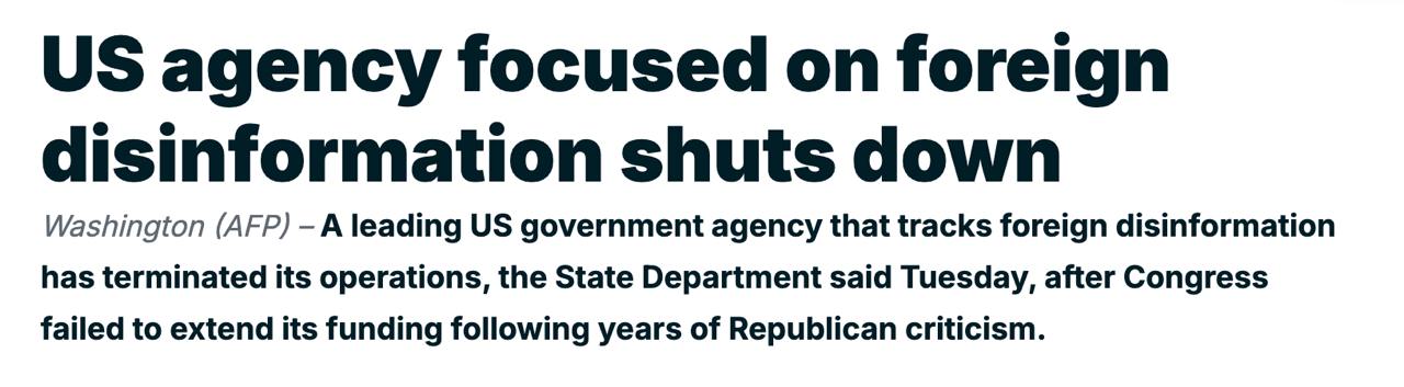 У США закрили Центр глобальної взаємодії (GEC) при Державному департаменті, який займався боротьбою з фейками, зокрема й антиукраїнськими. Республіканці звинувачували його в цензурі та стеженні за американцями.