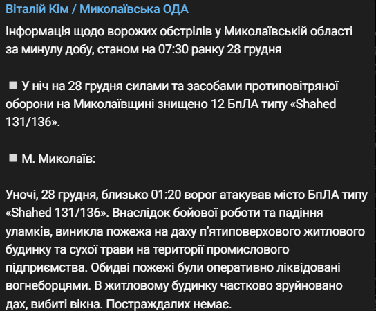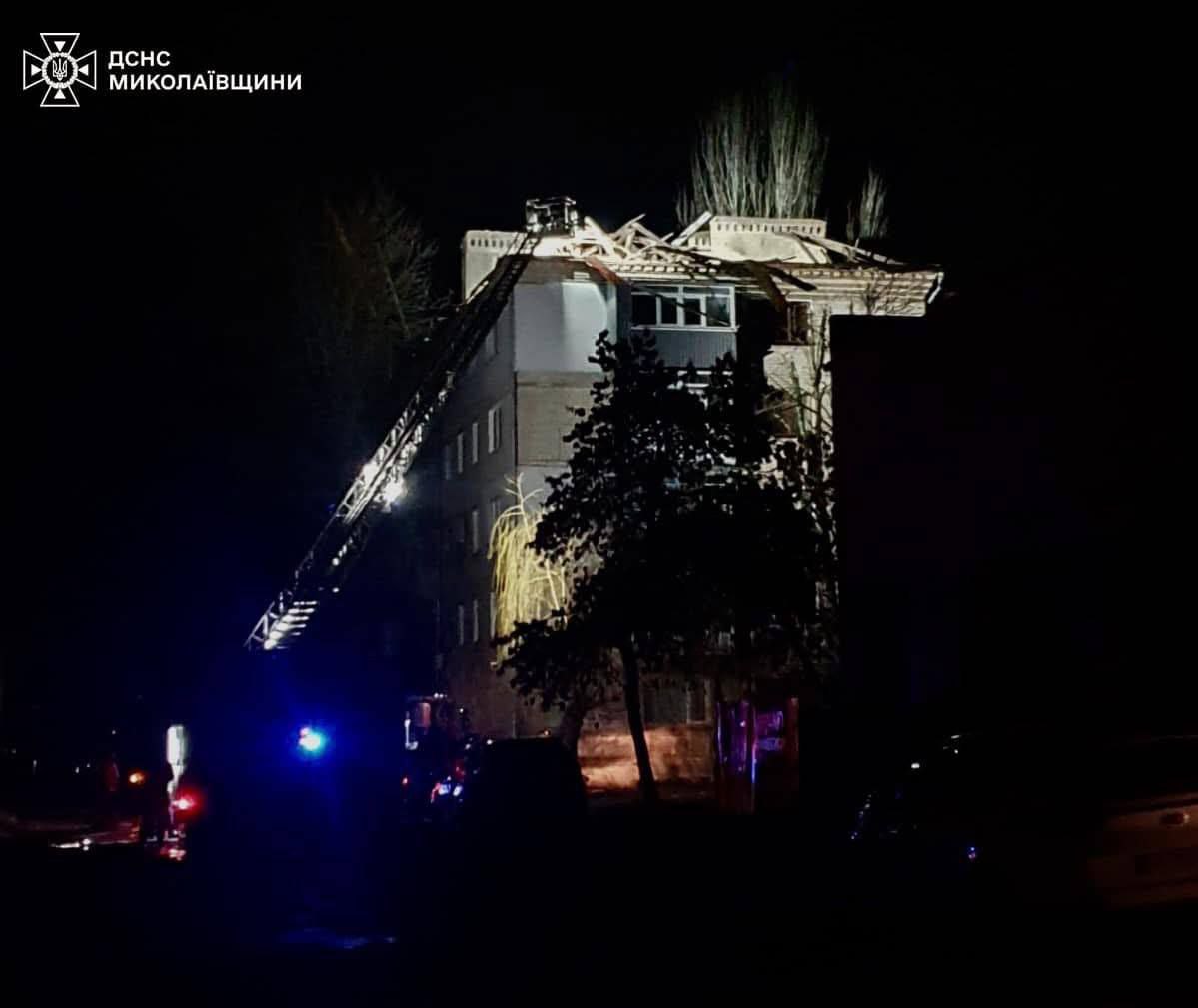Вночі у Миколаєві в Інгулецькому районі безпілотник потрапив територією підприємства та по даху багатоповерхівки. Пожежі ліквідовані, постраждалих немає.