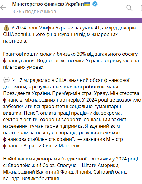 Київ отримав від західних партнерів у 2024 році 41,7 мільярда доларів. Вони дозволили виплатити зарплати лікарям та вчителям.