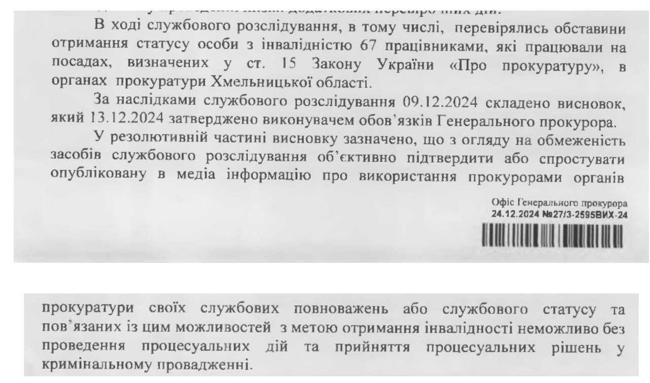 ЦПК направив запит до Офісу генпрокурора, щоб дізнатися про результати службового розслідування: чи отримали хмельницькі прокурори інвалідність, користуючись своїми службовими повноваженнями чи статусом. Проте відомство відповіло, що не змогло довести факту неправомірного отримання інвалідності жодного з 67 прокурорів Хмельницької прокуратури.