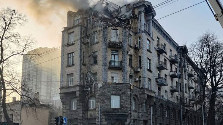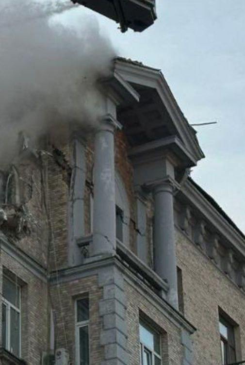 При ранковій атаці "Шахедів" на Київ постраждали відомий будинок на перетині вулиць Інститутської та Банкової, раніше званий "будинком Раднаркому", а також одна з будівель Нацбанку