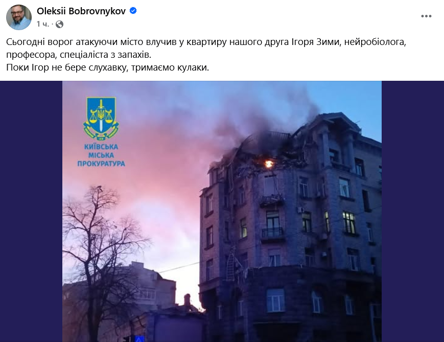 Також у соцмережах повідомляють, що зруйнованому будинку удар припав по квартирі відомого українського нейробіолога Ігоря Зими. На даний момент, за словами його знайомих, він не бере слухавки.