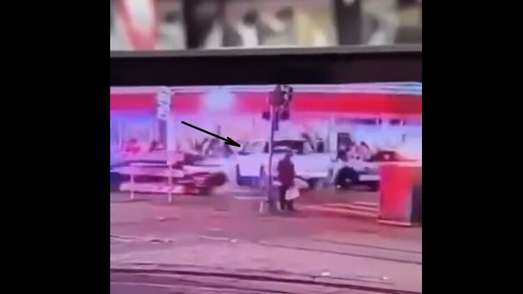 На кадрах видно, як білий великогабаритний пікап, що рухається завантаженою міською вулицею в якийсь момент згортає на паркувальну територію перед торговим центром, де врізається в пішоходів, роблячи розворот по другорядній дорозі.