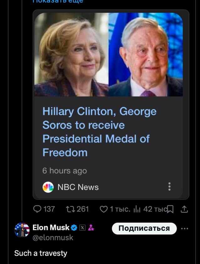 Найближчий соратник новообраного президента США Ілон Маск скептично прокоментував нагородження Сороса та Клінтон.