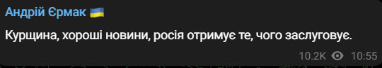 "Курщина, хороші новини, росія отримує те, чого заслуговує", - написав Єрмак.