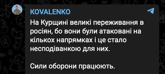 "На Курщині великі переживання у росіян, тому що вони були атаковані за декількома напрямками і це стало несподіванкою для них. Сили оборони працюють", - заявив голова ЦПД Андрій Коваленко.
