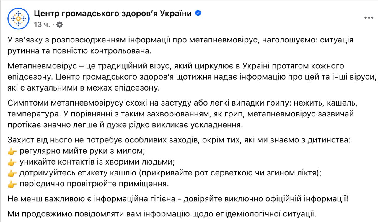 "Ситуація рутинна і повністю контрольована. Метапневмовірус - це традиційний вірус, який циркулює в Україні протягом кожного епідсезону. Порівняно з таким захворюванням, як грип, метапневмовірус зазвичай протікає значно легше і дуже рідко спричиняє ускладнення", - повідомляє відомство.