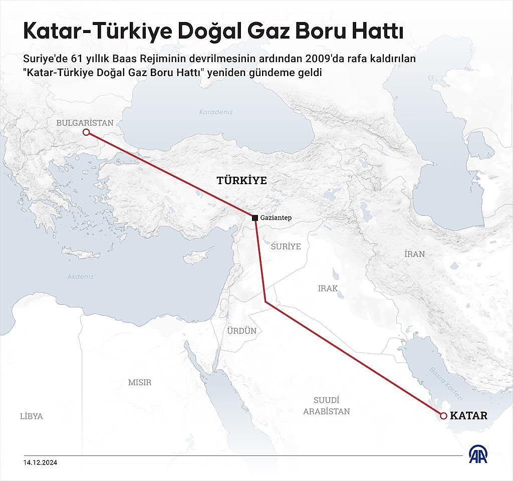 Після зміни влади у Сирії у грудні 2023 року ЗМІ писали про можливе відновлення проекту будівництва газопроводу з Катару до Туреччини через територію Сирії та інших арабських країн для постачання газу до Європи 4 січня глава Міненерго Туреччини Алпарслан Байрактар заявив, що катарський газ може постачати до Європи через територію Туреччини за умови створення безпечної системи транспортування та забезпечення стабільності у Сирії та регіоні.