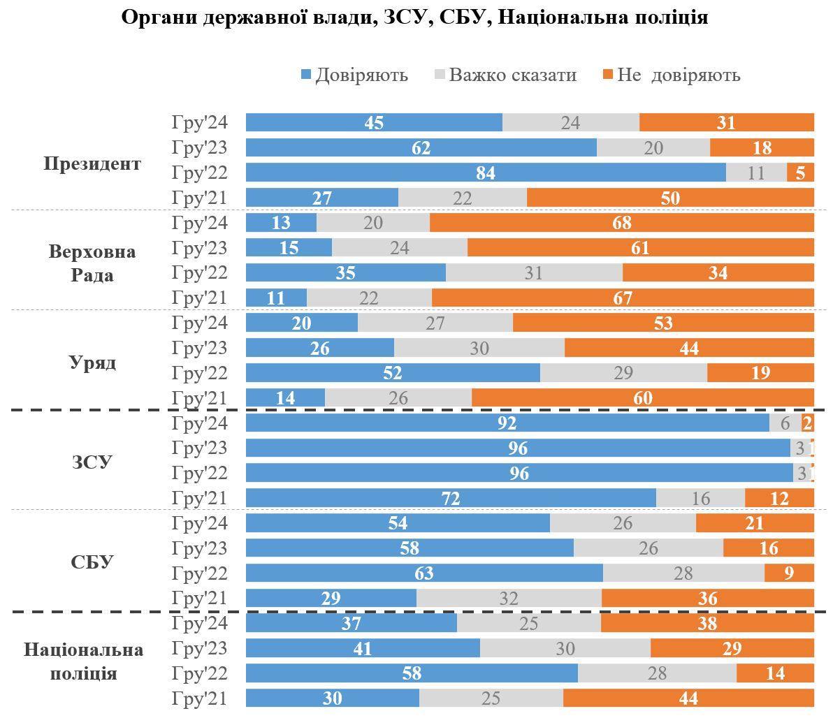 До президента Володимира Зеленського як інституту довіра впала на 39% - з 84% у грудні 2022 року до 45% двома роками пізніше.