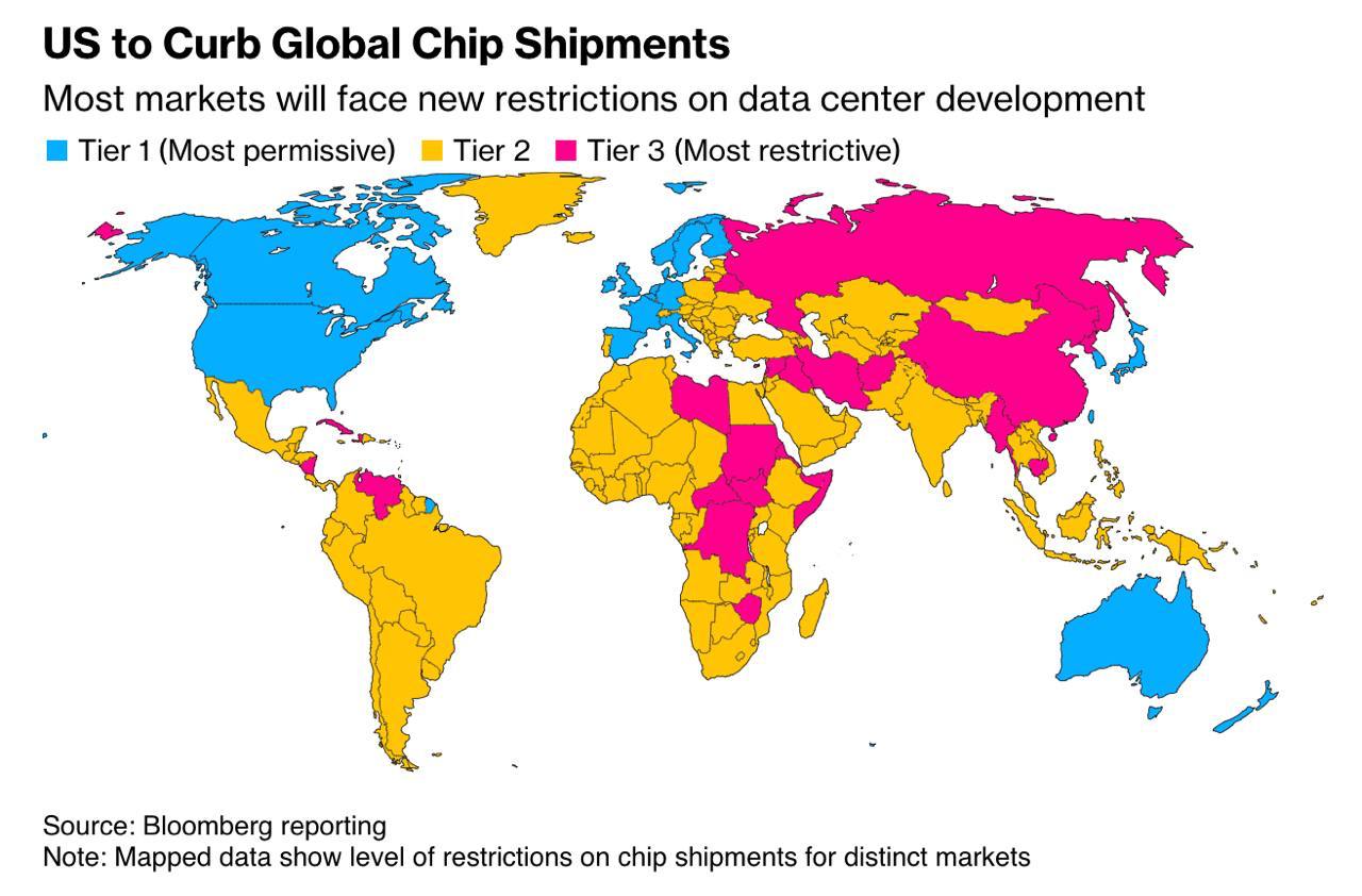 За інформацією видання, лише невелика кількість союзників США збереже необмежений доступ до американських чіпів. Такі країни увійшли до першої групи доступності чіпів (див. карту). У ній знаходяться лише 19 країн. Для решти світу пропонується запровадити ліміт на кількість обчислювальної потужності для кожної країни. Найбільш жорсткі обмеження запровадять для третьої групи із 20 країн, до якої входять Росія та Китай.