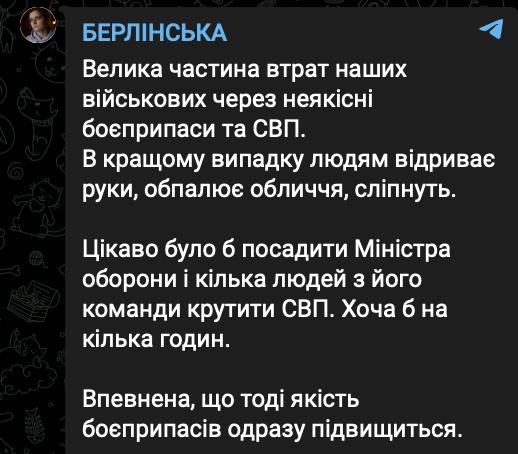 "Цікаво було б посадити Міністра оборони та кілька людей з його команди крутити СВП. Хоча б на кілька годин. Упевнена, що тоді якість боєприпасів одразу зросте", - заявила волонтер.