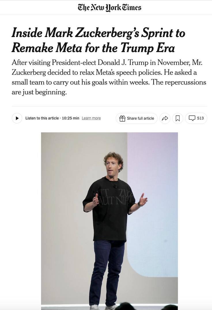Видання New York Times називають поточні зміни в корпорації "переробкою Meta для епохи Трампа", який обіцяв "зупинити трансгендерне божевілля" у перший день свого президентства.