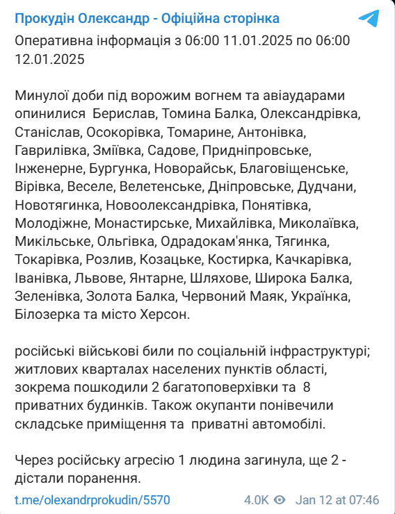 08:00 У Херсонській області через обстріл РФ 1 людина загинула, ще 2 - отримали поранення.