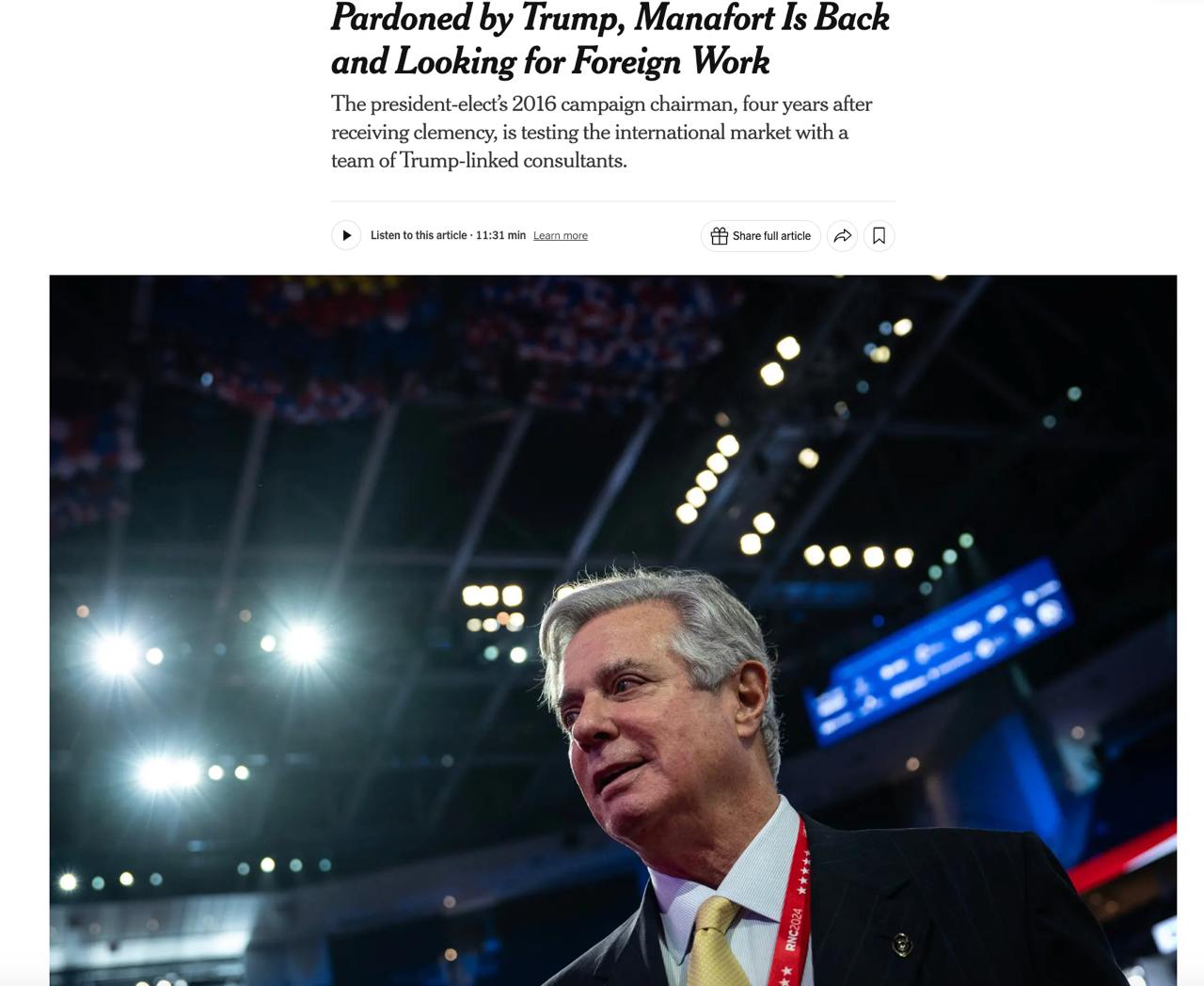 Після того, як його помилував Трамп – Манафорта звинувачували у незаконному лобізмі – він зібрав команду консультантів, які керували кампанією Трампа у 2024 році.