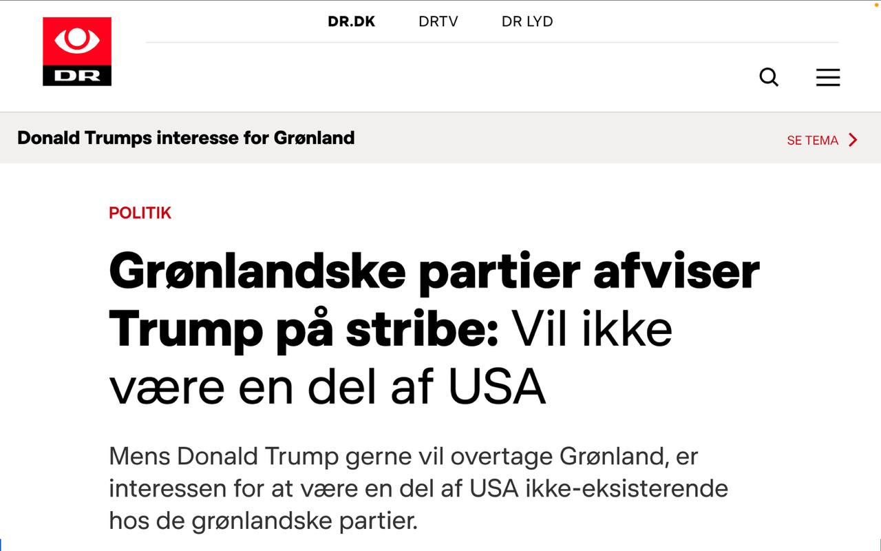 Тим часом учора газета Financial Times заявила, що всі опитані нею жителі Гренландії висловилися проти приєднання до США. Житель острова розповів, що найбільший політичний розкол у Гренландії проходить між тими, хто хоче більшої автономії у складі Данії, і тими, хто вважає, що Гренландія має стати незалежною.