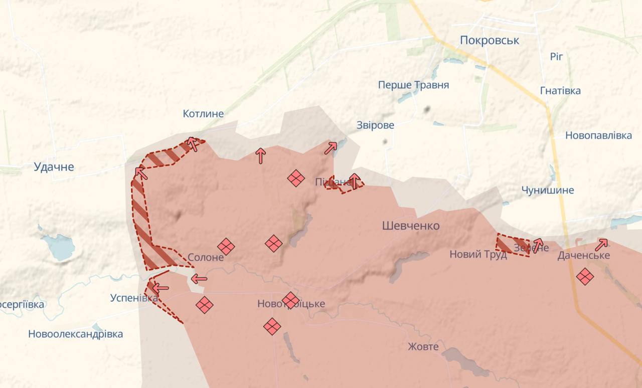 Під Покровськом військові РФ знову просунулися на півдні, на захід у напрямку Вдалого, на північ від напрямку Котлиного (дорога між цими селами вже перерізана), і на схід біля Воздвиженки у напрямку траси на Костянтинівку.