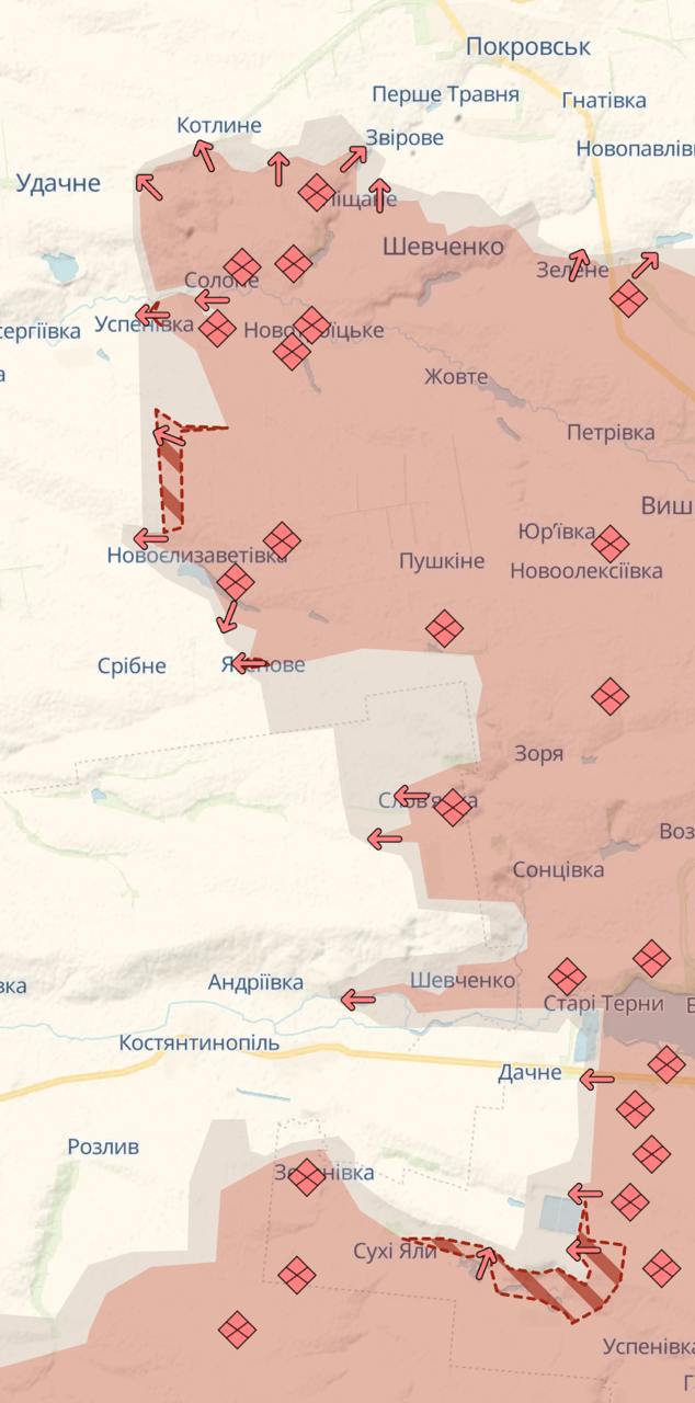Раніше ми підбивали підсумки попереднього дня. Росія заявила про захоплення Ненудного, що на південь від Великої Новосілки в Донецькій області. Також армія РФ продовжує просування під Покровськом та Кураховим. На захід від Курахового та Шевченка росіяни вийшли до околиць Андріївки, яка стратегічно важлива для контролю траси на Запоріжжі.