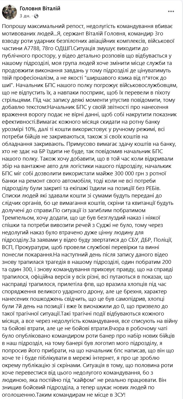 Командир 3-го взводу БПЛА 78-го полку Віталій Головня розповів про "кричущу" ситуацію у своєму підрозділі.