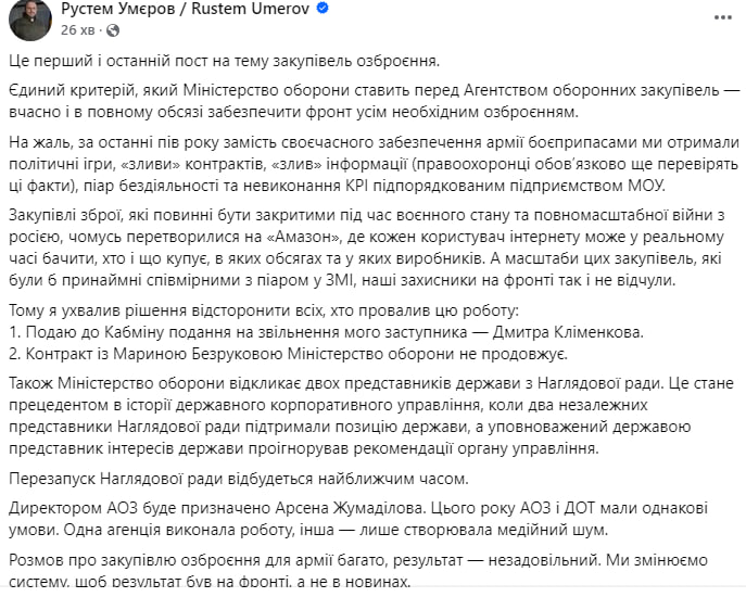 "На жаль, за останні півроку замість своєчасного забезпечення армії боєприпасами ми отримали політичні ігри, "зливи" контрактів, "злив" інформації, піар бездіяльності та невиконання КРІ підпорядкованим підприємством МОУ. Закупівлі зброї, які мають бути закриті під час військового стану та повномасштабної війни з Росією чомусь перетворилися на "Амазон", де кожен користувач інтернету може в реальному часі бачити, хто і що купує, в яких обсягах та у яких виробників. А масштаби цих закупівель, які були б принаймні пропорційні піару в ЗМІ, наші захисники на фронті так і не відчули», – пояснив Умеров.