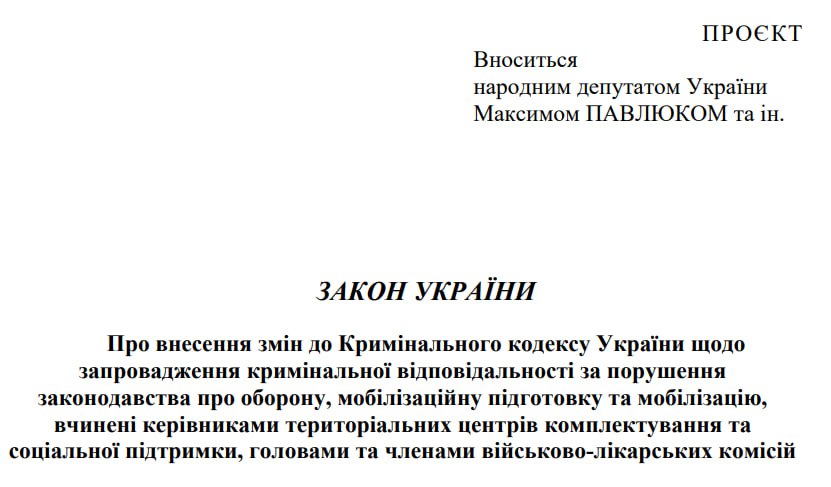 Співробітників ТЦК та ВВК пропонують садити на вісім років за незаконну мобілізацію чоловіків в Україні.