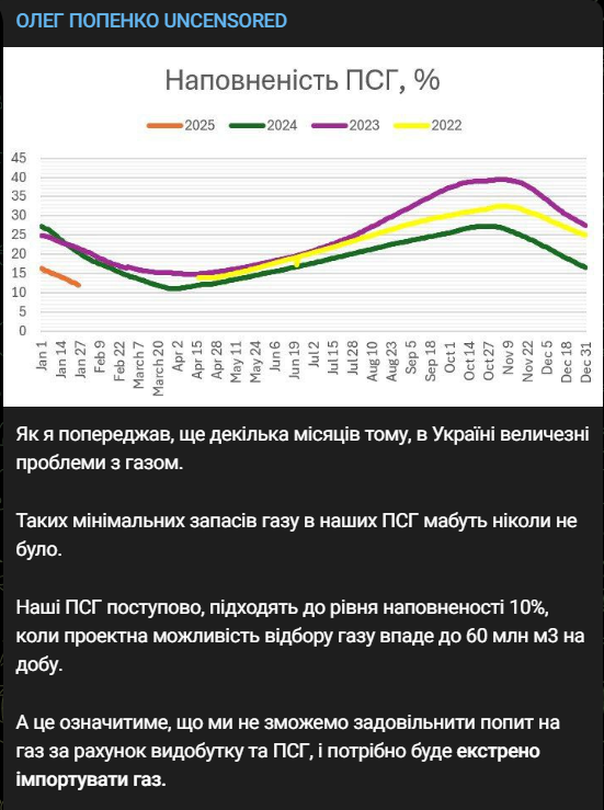 "Таких мінімальних запасів газу у наших ПСГ (підземних сховищах) мабуть ніколи не було. Наші ПСГ поступово підходять до рівня наповненості 10%, коли проектна можливість відбору газу впаде до 60 млн. м3 на добу", - написав він.