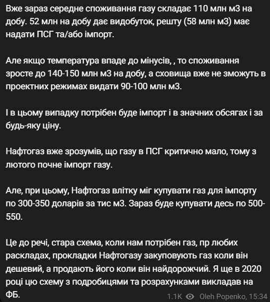 Попенко зазначив, що вже зараз середнє споживання газу становить 110 млн. м3 на добу. 52 млн на добу дає видобуток, решта (58 млн м3) має надати ПСГ та/або імпорт.